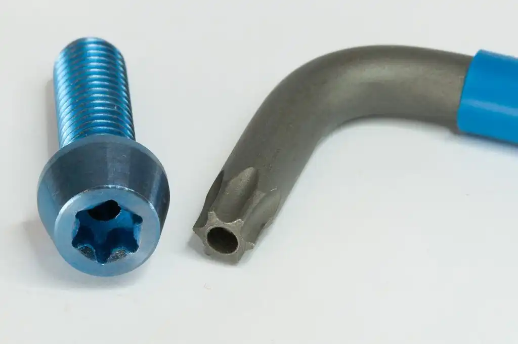 A security Torx L-key and fastener with holes for a safety pin to hinder disassembly with an ordinary Torx key.